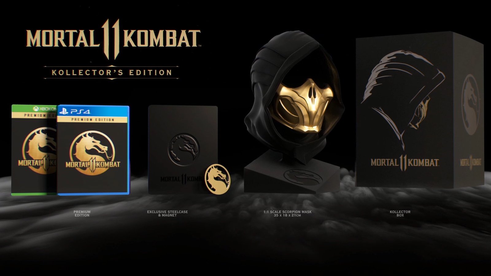 • Presentazione di Mortal Kombat™ 11 Kollector’s Edition, che comprende il gioco principale, il Kombat Pack, il busto con la maschera di Scorpion, una custodia esclusiva in metallo, una moneta magnetica commemorativa e la targa di autenticità.