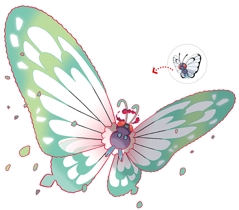 Le stupefacenti ali di questo Pokémon, divenute gigantesche, sono il suo tratto più distintivo. Le scaglie che le ricoprono emettono un bagliore accecante e possono paralizzare, avvelenare o addormentare gli avversari. Le sue scaglie sono senza dubbio l’arma più efficace di Butterfree!