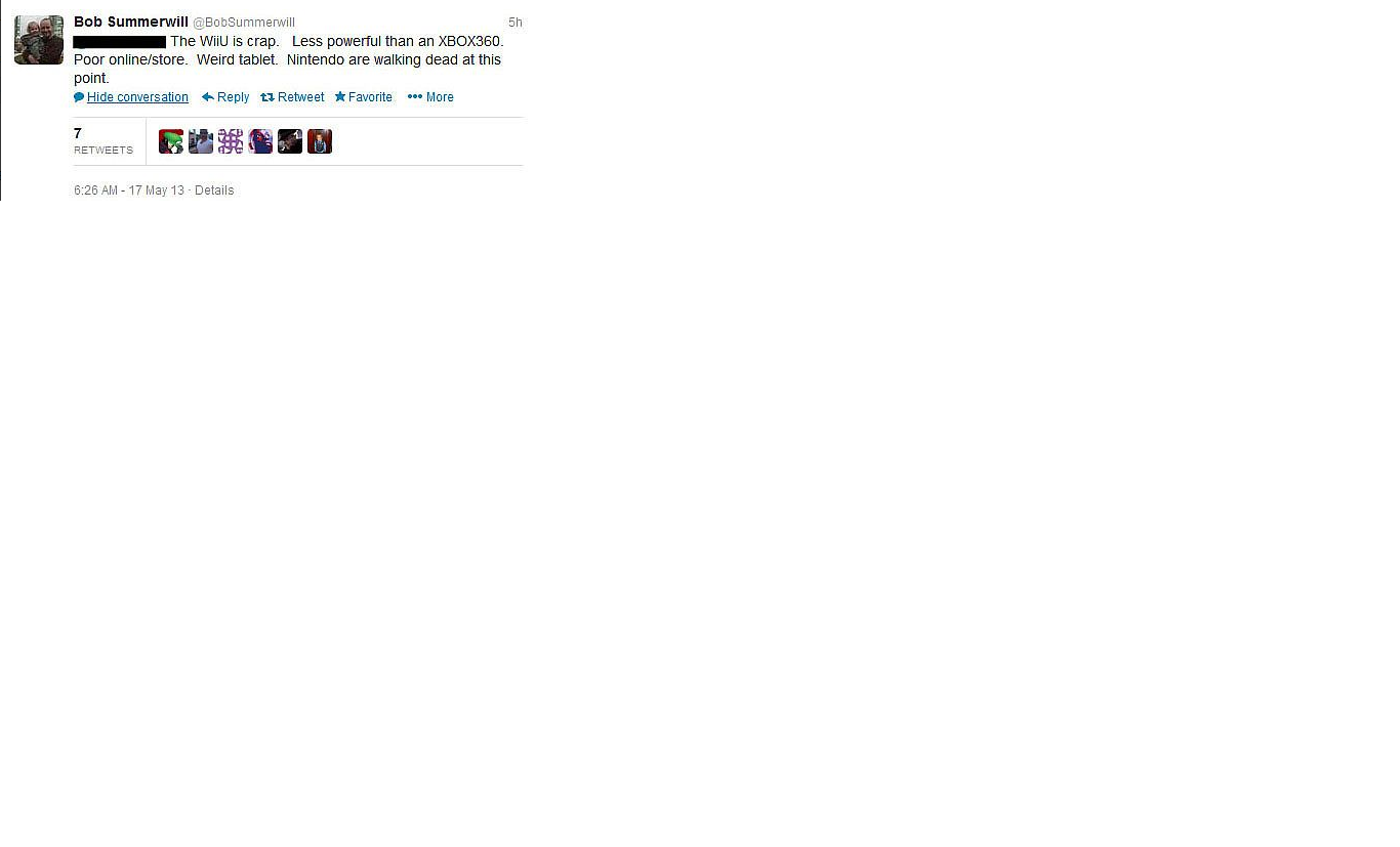 Che il preludio non fosse roseo è parso chiaro da subito; EA ha infatti cancellato ogni progetto in cantiere per WiiU come FIFA e Madden. Sta di fatto che, Bob Summerwill, oggi ha voluto parlare su Twitter senza troppi peli sulla lingua definendo la console uno schifo, con uno store online scadente e con una potenza di calcolo mediocre. “Nintendo pensa di essere ancora negli anni 90′, è ora che impari a stare al passo con i tempi; non può contare sempre e comunque su Mario e Zelda (portano soldi solo loro).”