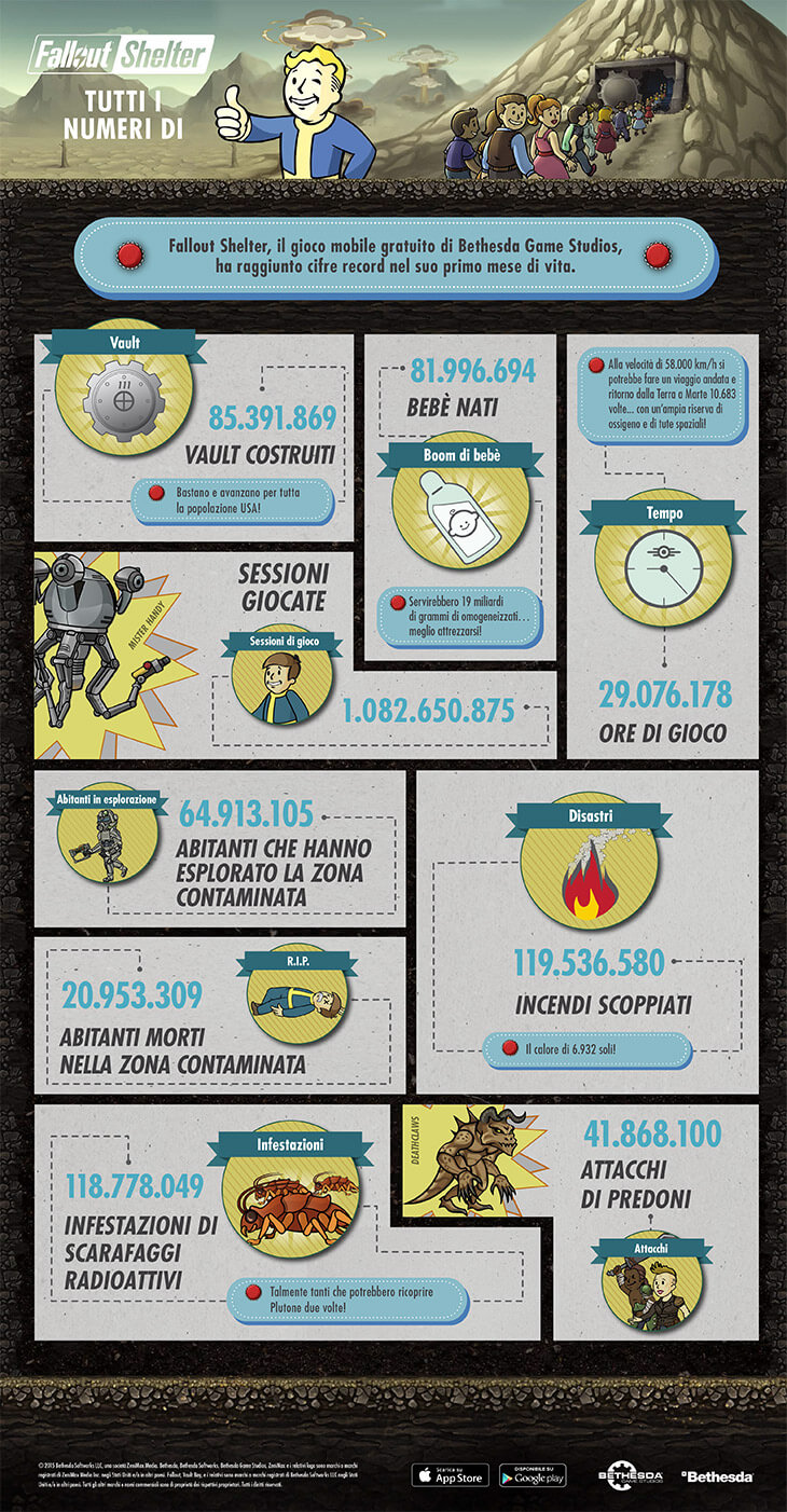 Una cosa è parlare dei fantastilioni di Vault creati o degli ultramiliardi di bambini venuti al mondo in Fallout Shelter, il gioco gratuito scaricabile da Google Play e dall’ App Store. Un’altra cosa è consultare le statistiche del gioco a un mese dalla sua uscita. Pertanto abbiamo messo al lavoro alcuni abili abitanti al fine di recuperare un po’ di numeri e accorparli in comodi grafici che mostrano di tutto, dalle infestazioni di scarafaggi radioattivi alle incursioni di predoni e tanto altro ancora. Ecco qui!