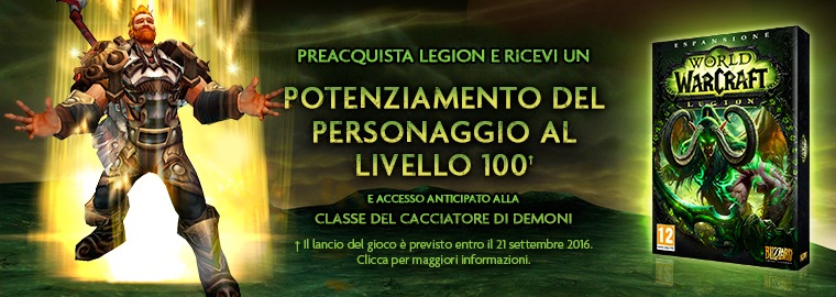 *I giocatori che aggiornano da un’Edizione introduttiva di World of Warcraft dovranno aspettare la rimozione delle restrizioni dell’edizione di prova, e potrebbero volerci fino a 72 ore prima di poter usare il potenziamento del personaggio. Le tempistiche dell’accesso anticipato al Cacciatore di Demoni verranno annunciate in futuro. È ammesso un solo Cacciatore di Demoni per reame. Richiede un personaggio di livello 70 sullo stesso reame. Legion uscirà nell’estate 2016 (inverno 2016 nelle regioni dell’emisfero meridionale).