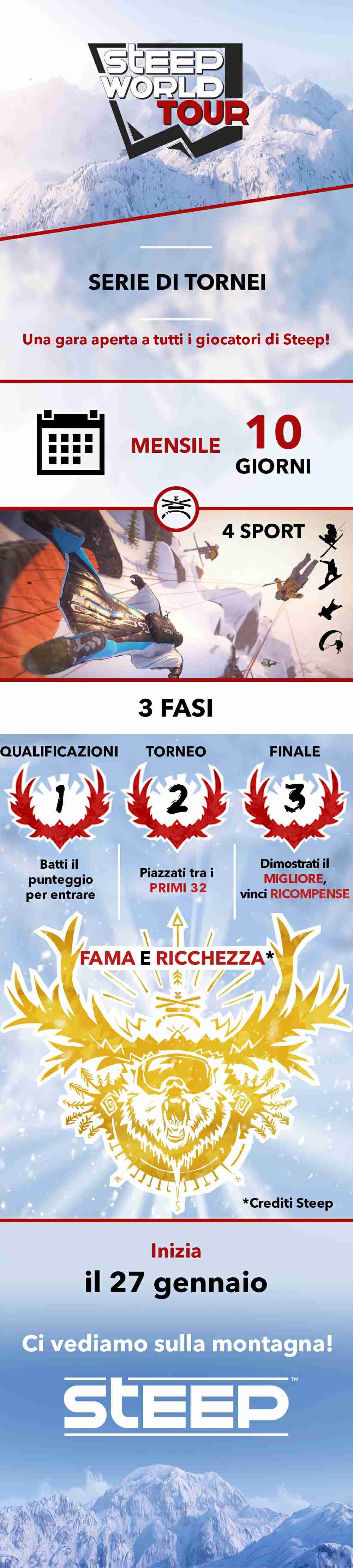 - Steep World Tour Tournament, visitare http://steep.ubisoft.com/game/it-IT/news/detail.aspx?c=tcm:158-282608-16&ct=tcm:158-76770-32 e http://steep.ubisoft.com/game/it-IT/news/detail.aspx?c=tcm:158-282623-16&ct=tcm:158-76770-32. Per vedere il video “Steep World Tour”, visitare https://youtu.be/fajgoEENijU.