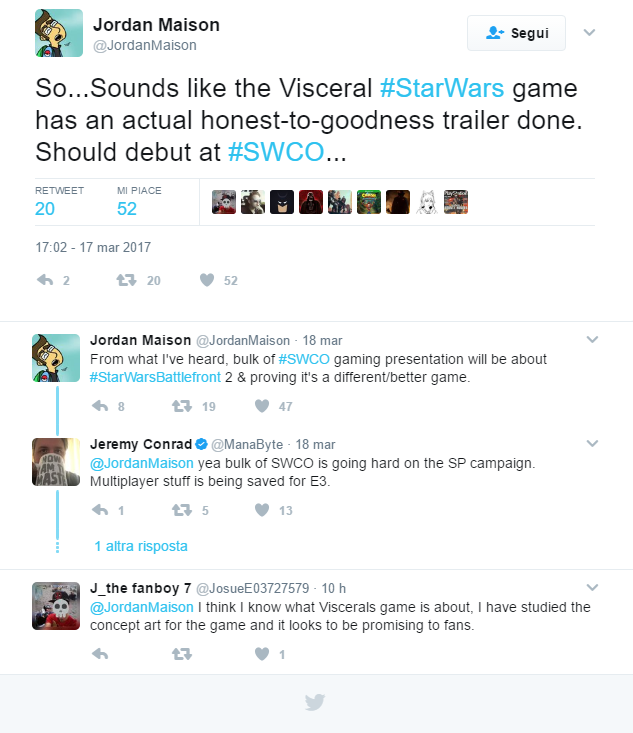 Visceral Games annuncerà un nuovo titolo di Star Wars ? Jordan Maison di Cinelinx, ha dichiarato sul proprio profilo Twitter che la software house sta lavorando ad un nuovo capitolo di Star Wars e che verrà annunciato con un trailer durante l’evento “Star Wars Celebration” che si terrà ad Orlando da 13 al 16 Aprile 2017.