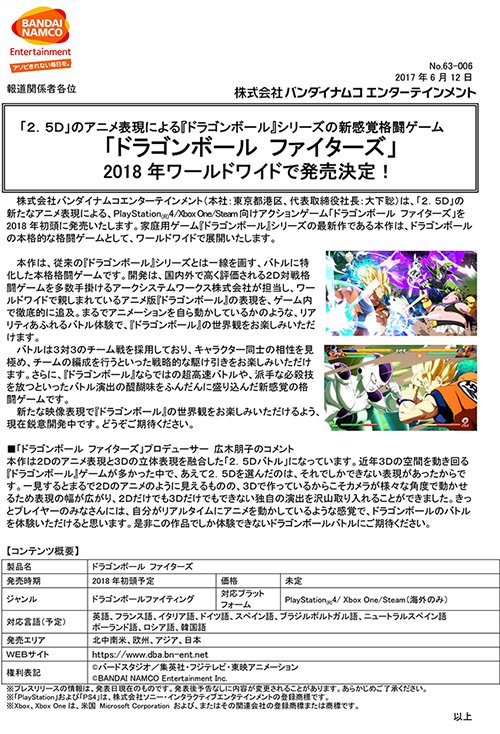 In queste ultime ore è apparso sul sito ufficiale giapponese di Bandai Namco (poi rimosso) un documento riguardante Dragon Ball Fighters, un picchiaduro in 2.5D con combattimenti 3 vs 3 in sviluppo presso Arc System Works, il team di Guilty Gear e BlazBlue.