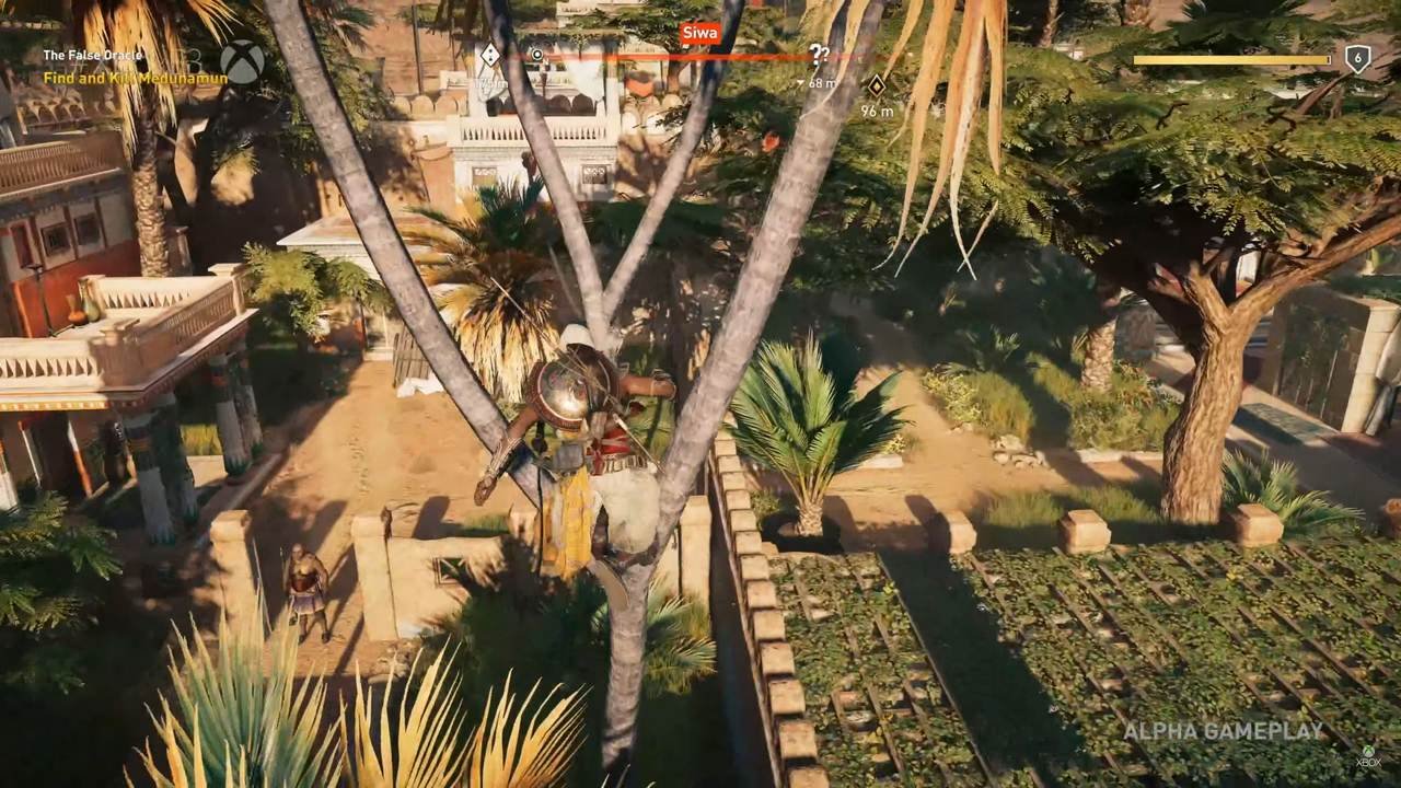 Saliti in groppa al nostro cavallo, ci siamo quindi addentrati all’interno della cittadina. Il primo impatto (quello visivo) è stato sicuramente positivo. Questa volta, dopo Unity e Syndicate, si è deciso di abbandonare le grandi metropoli del passato, per ritornare un po’ alle origini della serie (un po’ come ci suggerisce il nome di questo nuovo capitolo). Le ambientazioni sono suggestive e Ubisoft, come sempre, ha svolto un lavoro certosino per caratterizzare al meglio lo spazio che ci circonda, che sembra realmente in vita, a prescindere dalle nostre azioni: gli abitanti, in umili vesti, svolgono le loro mansioni quotidiane: commerciano, puliscono le strade, parlano tra loro e poi ci sono bambini che giocano, cani e gatti che gironzolano per la cittadina. Tutto intorno, un Egitto che prende davvero vita intorno a noi, è probabilmente la prima volta che possiamo assaporare questa ambientazione con un tale grado di realismo. Intorno al villaggio invece: dune di sabbia, alte palme e strade battute che collegano i vari insediamenti. Un panorama davvero incredibile che testimonia l’ottimo lavoro svolto da Ubisoft (e siamo solo al codice Alpha!).