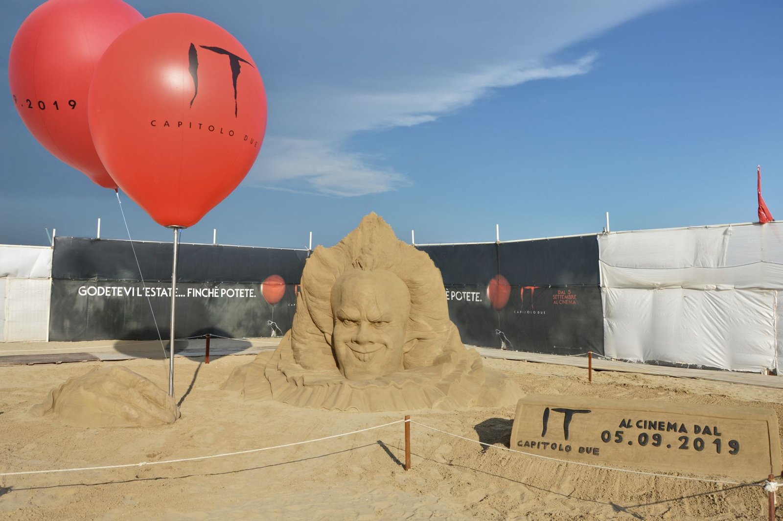 L’imponente ed inquietante scultura rappresenta il volto di Pennywise e la sua mano, dalla quale parte l’immancabile ‘palloncino’ rosso, che per l’occasione è stato “raddoppiato” proprio ad indicare il secondo capitolo. È possibile ammirare l’opera presso il ‘Beach Stadium’ nella spiaggia libera di Cervia.