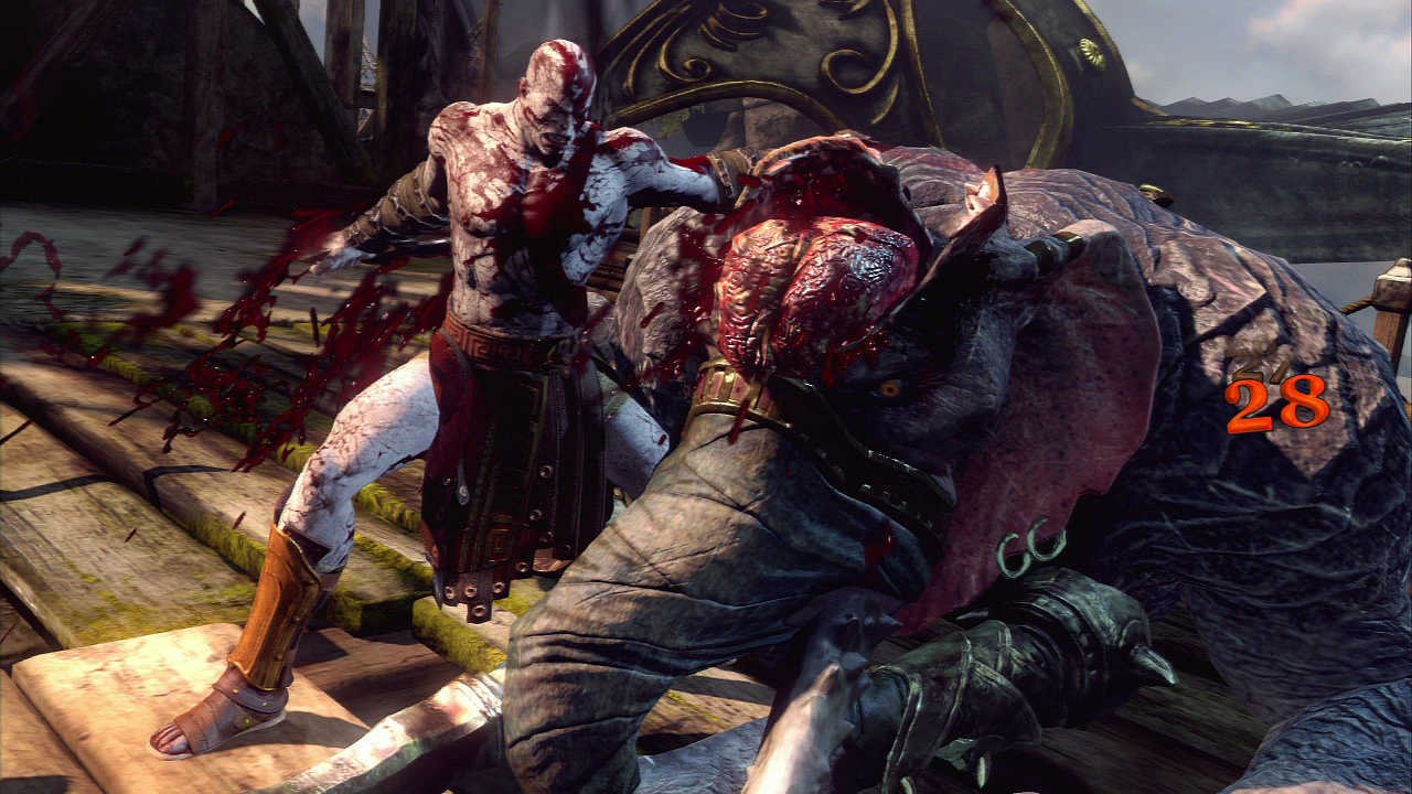 Il combat system di base è ancorato alle salde radici che da sempre hanno caratterizzato la saga: un tasto per l’attacco leggero, uno adibito agli attacchi pesanti, schivate, parate e quant’altro. Elementi basilari a parte, le vere novità di questo sistema di combattimento sono principalmente tre, e influiranno non poco durante l’infuriare delle battaglie. La prima novità consiste in un tasto apposito al combattimento corpo a corpo (il cerchio), col quale avremo modo di disarmare diversi tipi di nemici ed impadronirci delle loro armi, utilizzandole come nostre secondarie; si tratta delle cosiddette armi ambientali (lance, mazze, spade…), che potremo sostituire ogni qualvolta ne troviamo una nuova. La seconda novità è rappresentata dalla possibilità di incatenare un nemico e utilizzarlo come “arma” contro altri nemici, oppure semplicemente potremo tenerlo immobilizzato mentre riversiamo la nostra furia contro qualcun altro. Per cui azioni come scagliare un nemico contro altri, usarlo come ariete o semplicemente divertirsi a sbatterlo da una parte all’altra saranno all’ordine del giorno, anzi, si riveleranno particolarmente utili contro semplici nemici che, nel collettivo, possono formare un gruppo pericoloso (soprattutto alle difficoltà più elevate). La terza novità, e forse la più importante, riguarda la gestione delle combo e dell’ira degli Dei. A differenza dei precedenti God of War, Kratos non potrà sempre far affidamento alle ormai leggendarie combo che lo hanno reso famoso. Soltanto dopo aver riempito la barra dell’ira (come sempre prendendo a mazzate i nemici) potremo veramente sfruttare tutto il potenziale del generale spartano e godere dei potenziamenti delle lame del caos. L’ira degli Dei calerà solo in caso di danno da parte dei nemici, per cui avere una buona difesa darà modo di aver il miglior attacco. Si tratta quindi a conti fatti di un vero e proprio downgrade di Kratos e, nonostante si riveli comunque una macchina da guerra ben congegnata, tutto ciò contribuirà a rendere i combattimenti leggermente più difficili in confronto al passato.
